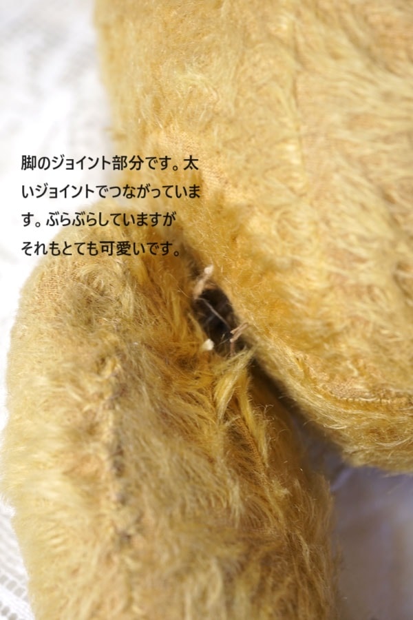 ステッチノーズ、グラスアイ、モヘアフラシ天、スタッフィングは木毛、手足のパットはレキシン、5ジョイント。