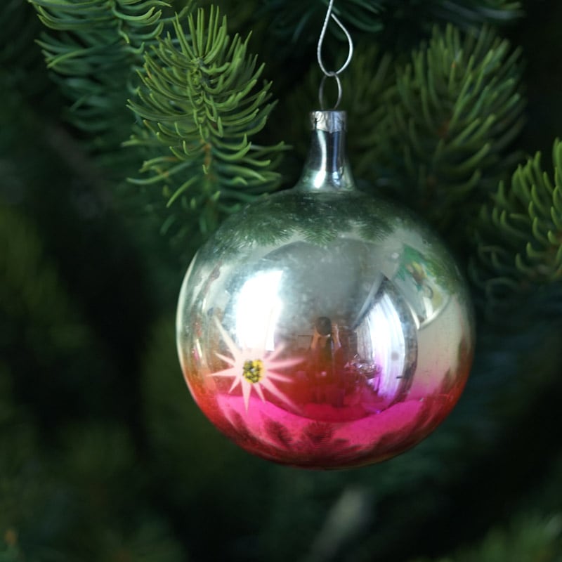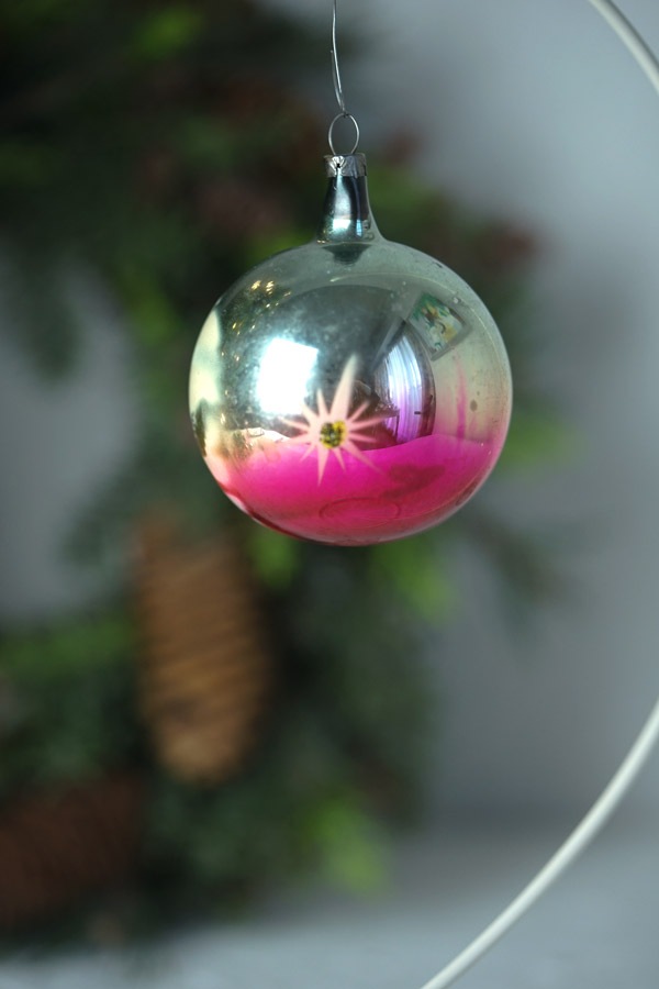 シルバーのマーキュリーガラスボールに、レッドパープルのグラデーションと
