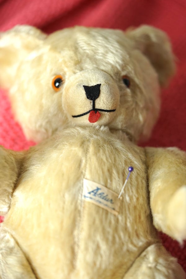グラスアイ、グロウラーなど、ヴィンテージベアならではのディテールが詰まっています。お腹には「Aldur」の刺繍タグが付いています。