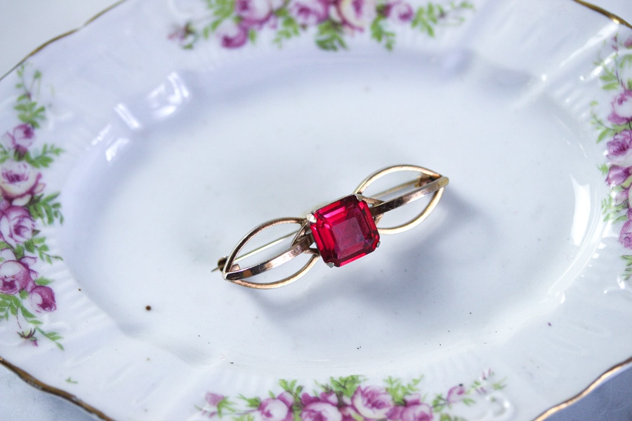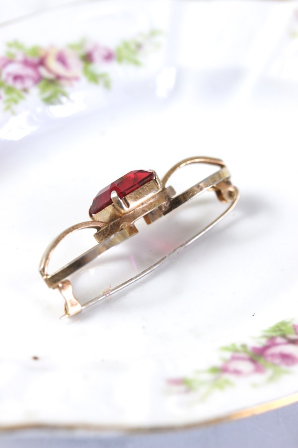 気品と美しさを兼ね備えた、ワインレッドのカットガラスとロールドゴールドのブローチ。