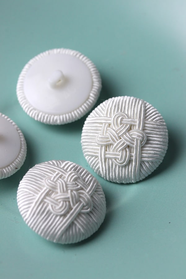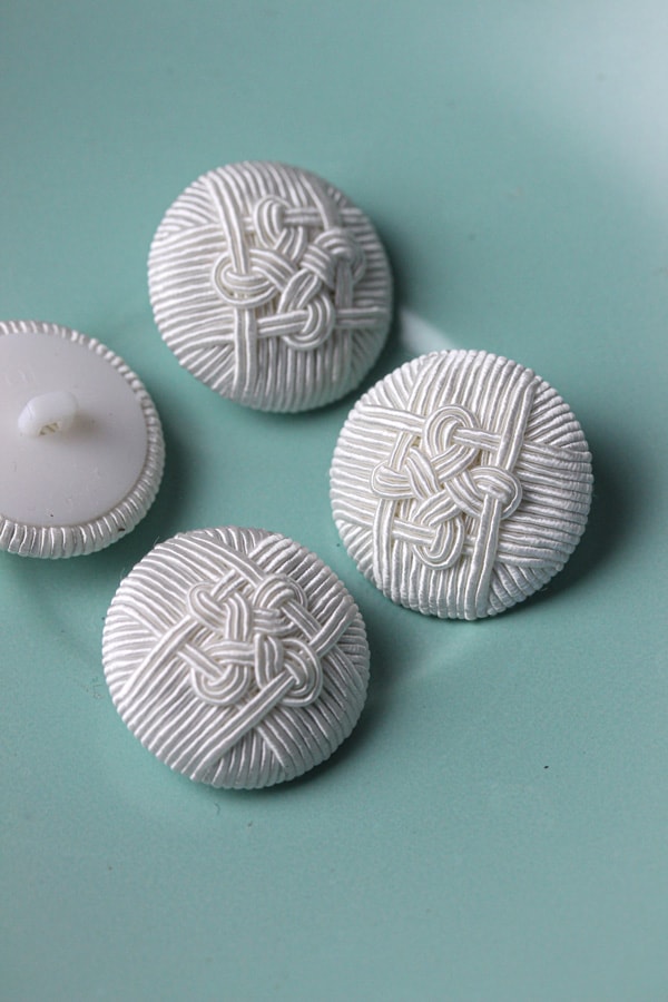 純白の手芸コード編み込みボタンです。フォーマルな純白のドレスにつけても素敵です。