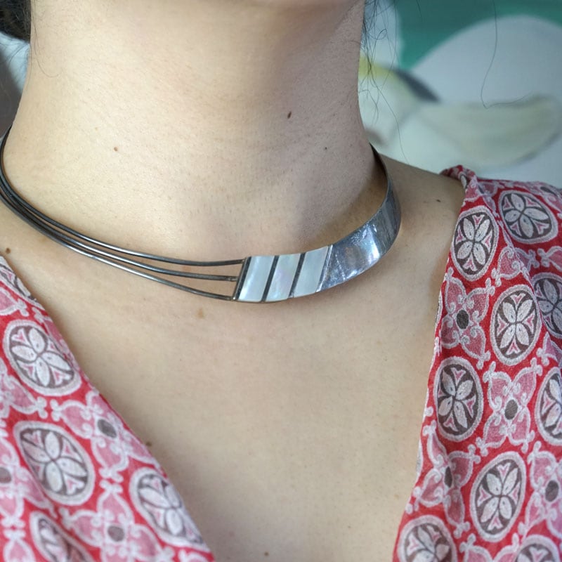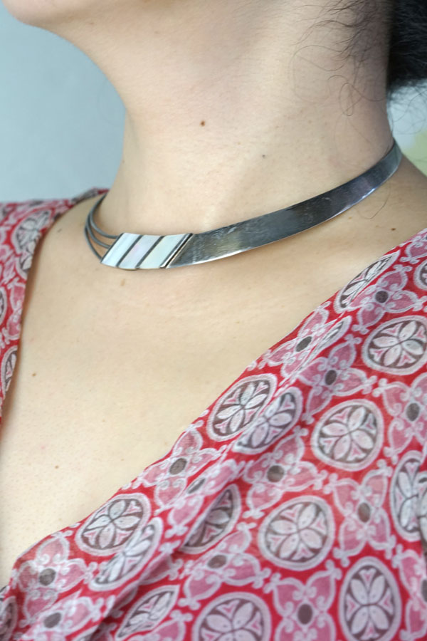 シックな輝きを放つ、メキシカンシルバーとマザーオブパールのヴィンテージチョーカーです。いぶし銀の風合いが美しいシルバーは、周囲35.5cm。
