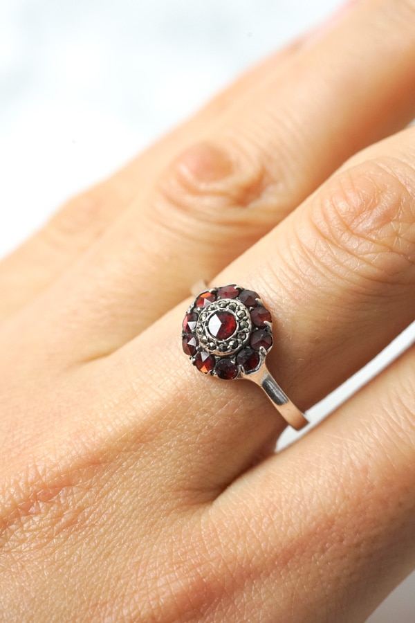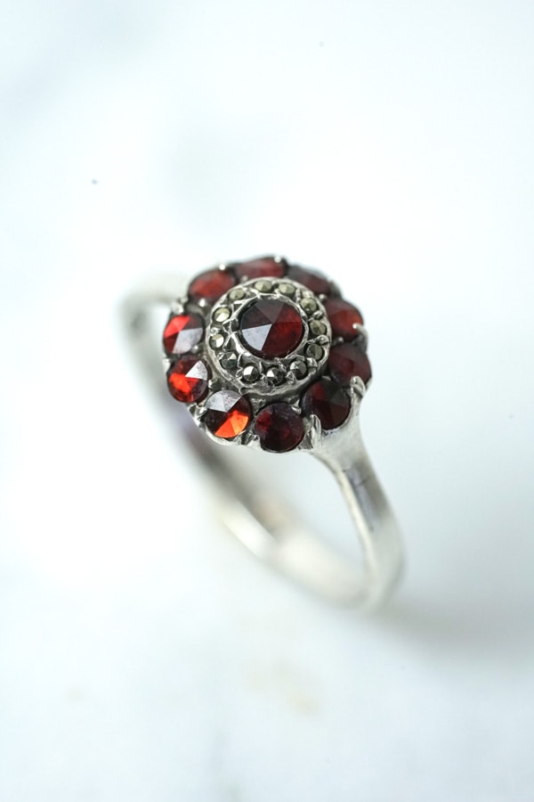 19世紀後期〜20C初頭頃 オーストリア製 アンティーク シルバー ガーネット&マルカジット フラワーリング 15号 ga-1196