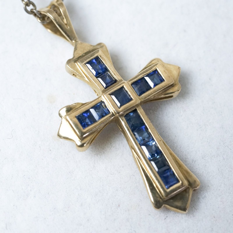 12石のサファイヤがゴールドの中にしっかり守られているクロスです。