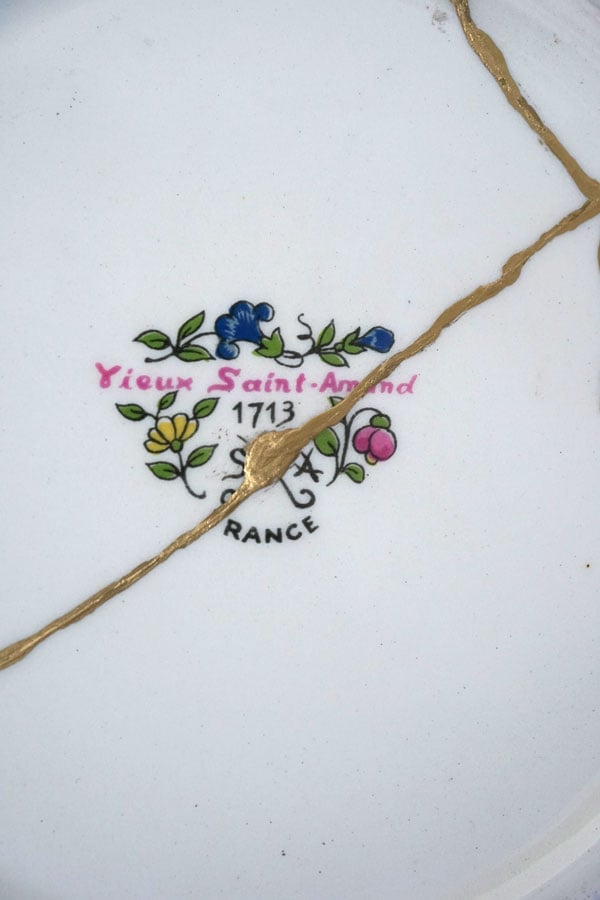 輸入アンティーク通販TOP >傷跡も、また景色。金継ぎで紡ぐアンティーク食器の輝きフェア > 金継ぎ+手描きのお花が可愛いサンタマン Vieux Sanit Amand の平皿25cm 1940-50年代 gc-1863