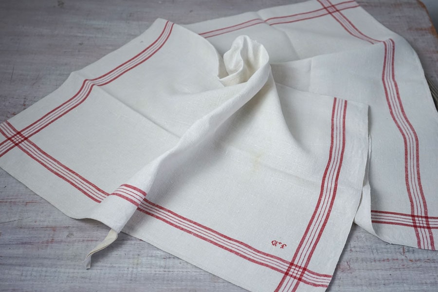 アンティークレッドラインのキッチンリネンです。レッドのラインがとても素敵です。