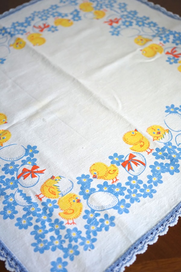柔らかなリネン生地に、ひよことたまごの可愛らしい絵柄が描かれ、縁には手編みのクロシェレースが丁寧に施されています。