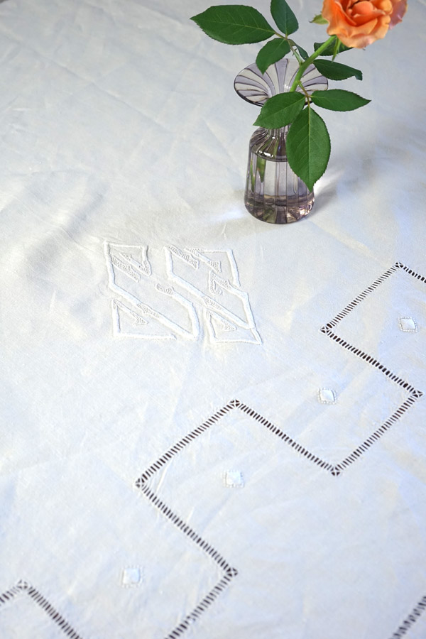 1920年代頃のフランス製ホワイトワーク刺繍の「ドラ」(ベッドリネン)W220×105cm gli-0374