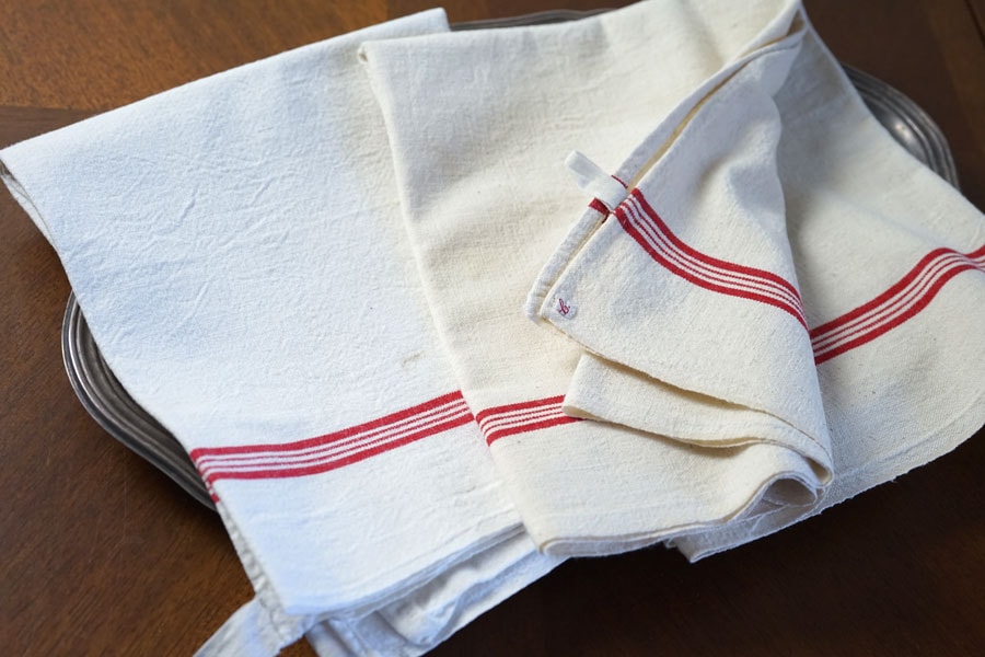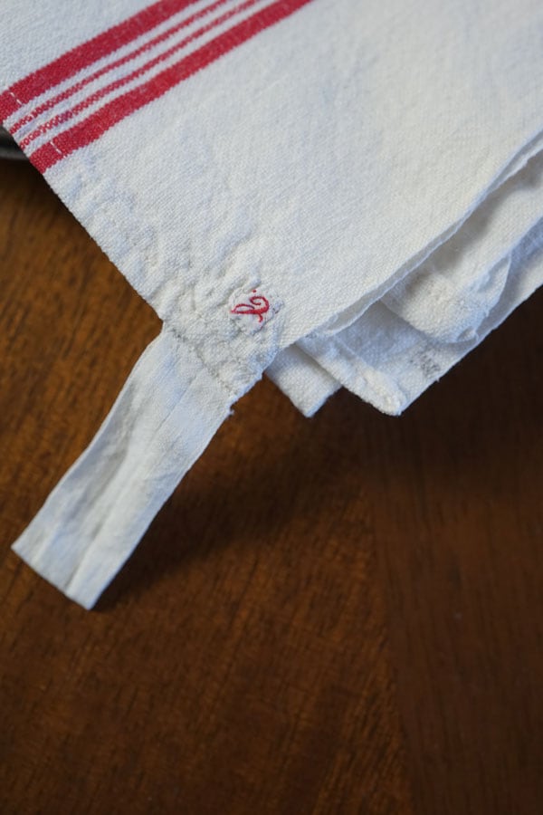 小さなイニシャルが縫い付けてあって愛着が湧くキッチンリネンです。
