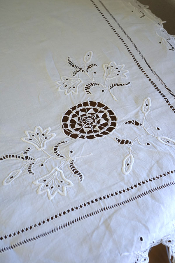 幅240cmの両サイドと中心にニードルワークとカットワークのホワイトワーク刺繍があります。