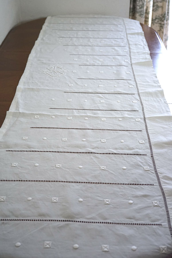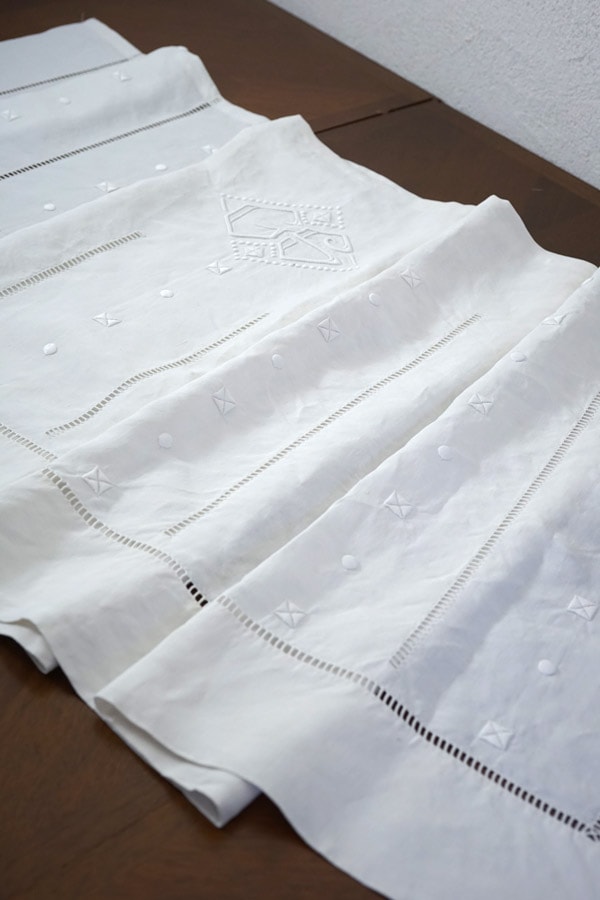 ベッドのピーロ―に掛ける部分のリネンで、刺繍の部分だけをカットしてありました。