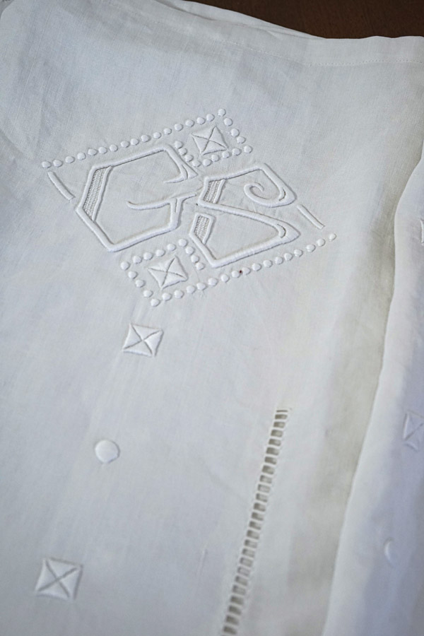 アールデコのホワイトワーク刺繍&CGのモノグラム刺繍のドラ=ベッドリネンです。風合いの良いさらっとしたリネンです。