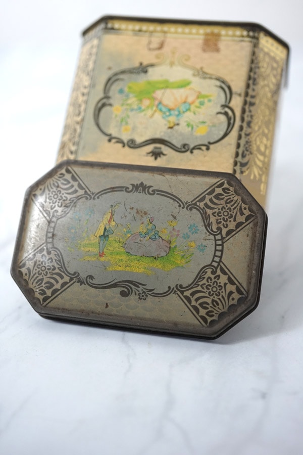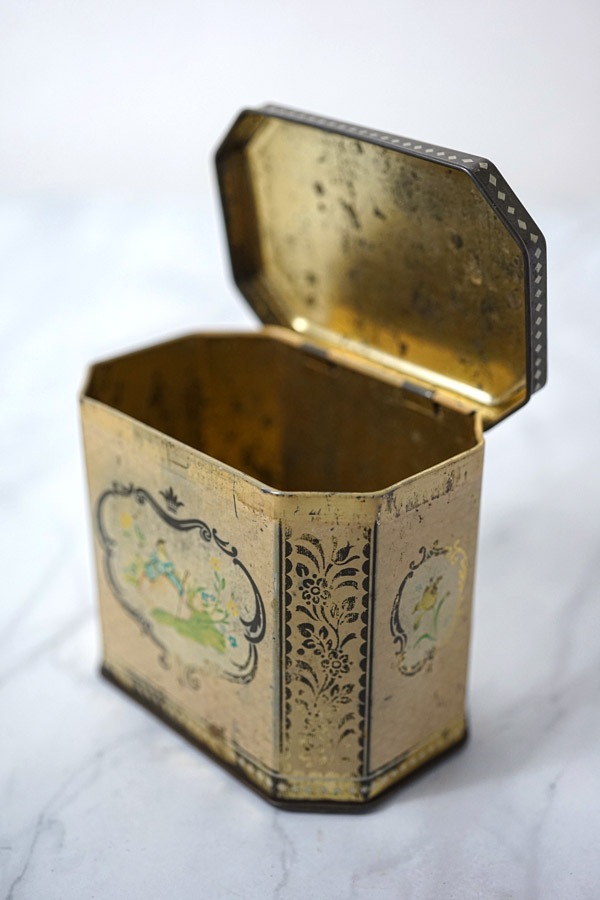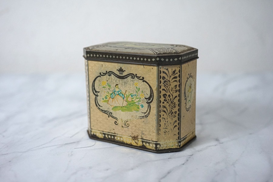 輸入アンティーク通販TOP >アンティーク食器・陶磁器・テーブルウエア > イギリスのクリノリンレディーのティン缶W11.5×D7.7×H10cm 1940年代頃 gk-655