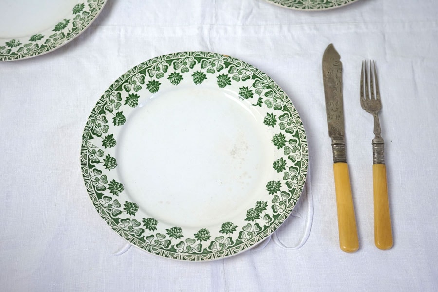 バドンヴィレのクローバ(Badonviller Trèfle)デザート皿です。1カ所縁に小さなチップがありましたので金継ぎで修復しました。モスグリーンのクローバーがくっきりとお皿を囲んでいるデザートプレートです。