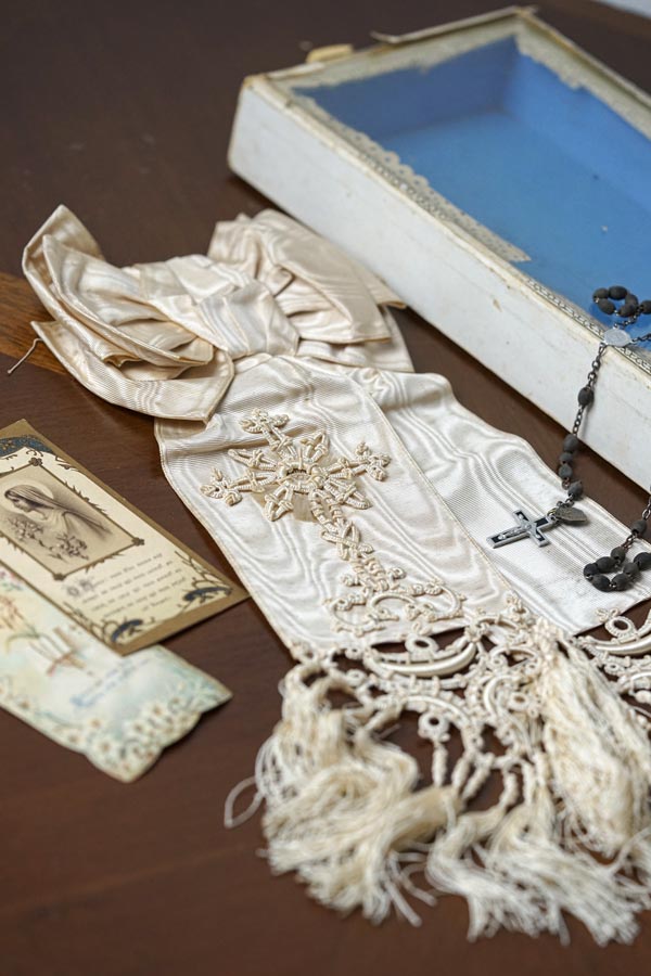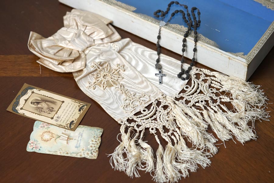輸入アンティーク通販TOP >アンティークドレス > フランスのジュニア堅信式用リボンとロザリオ箱入りセット1922年 gd-272