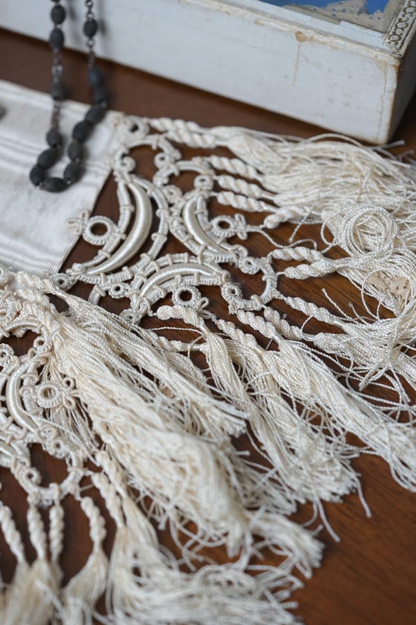 • ハンドワークの細かいステッチのモチーフが集まった飾りが素晴らしいリボンです。房も美しいです。