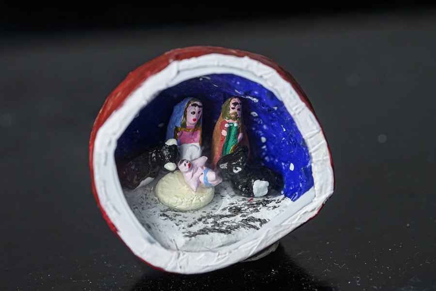なんとクルミのお部屋の中に粘土細工でイエス様のご降誕の情景がセットされています。