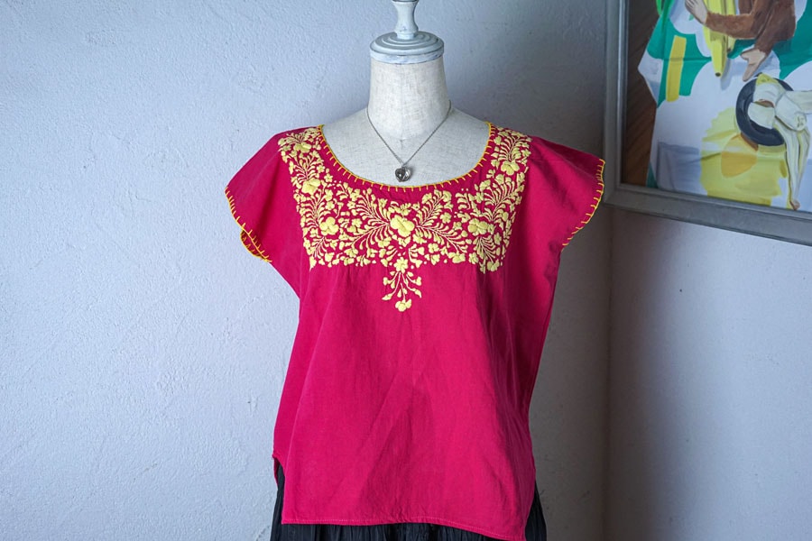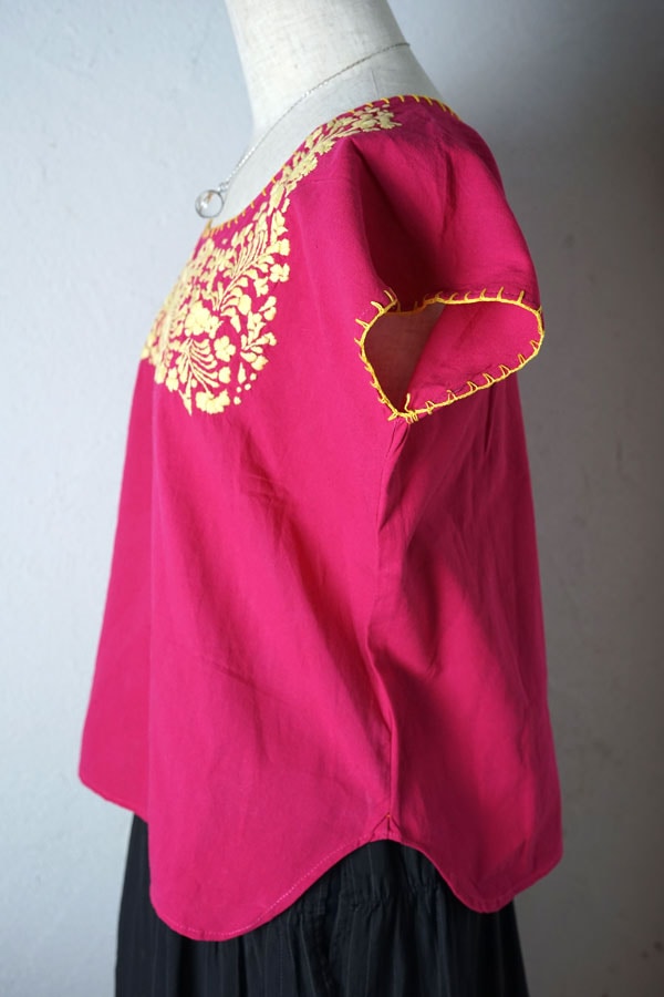メキシコ【オアハカ旅の出会い】濃いローズコットンに黄色の刺繍が美しいブラウス gd-280