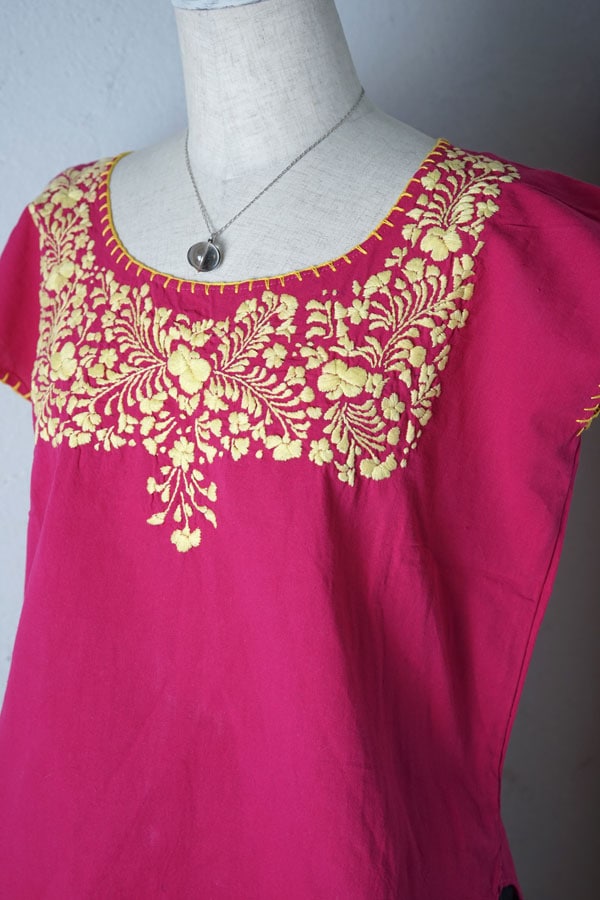 輸入アンティーク通販TOP >アンティークドレス > メキシコ【オアハカ旅の出会い】濃いローズコットンに黄色の刺繍が美しいブラウス gd-280