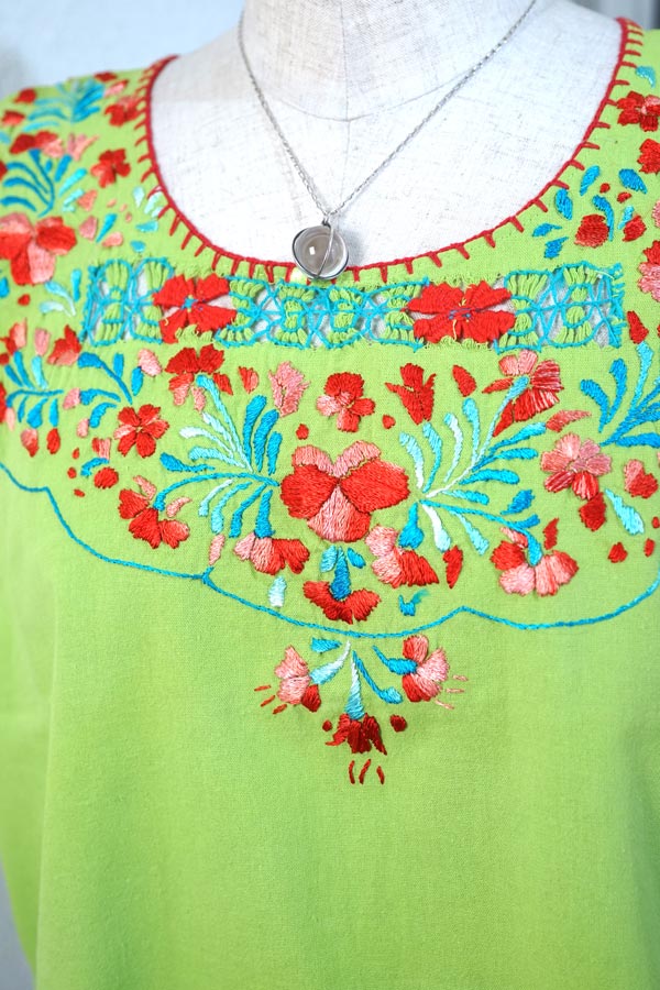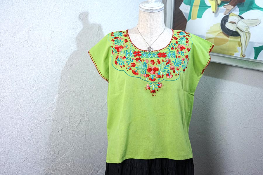 輸入アンティーク通販TOP >インスタグラム掲載商品 > メキシコ・オアハカのライムグリーンにパンジー刺繍ブラウス gd-283