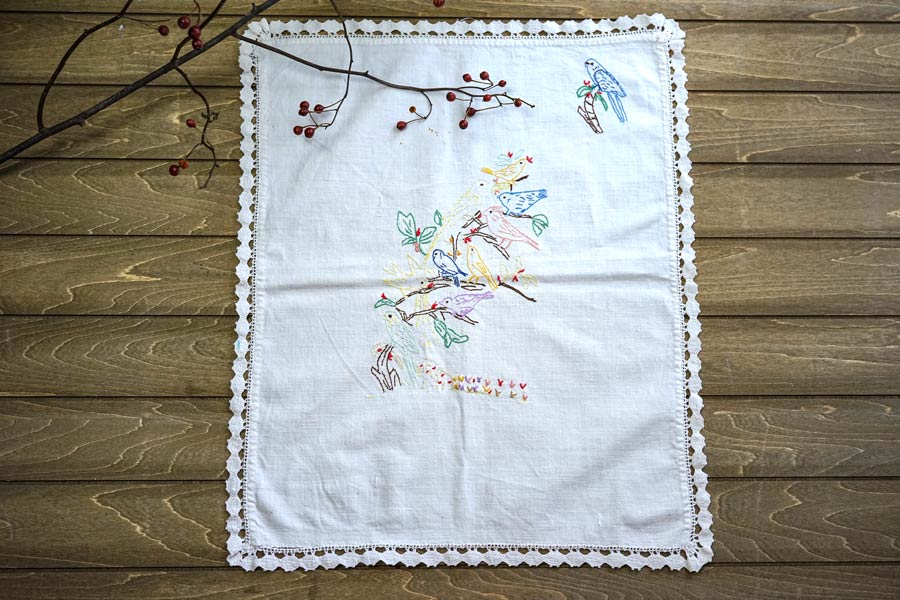輸入アンティーク通販TOP >インスタグラム掲載商品 > エモーショナルな8羽の小鳥たちが戯れる刺繍・レースの縁取りのマット43×36cm ge-1162