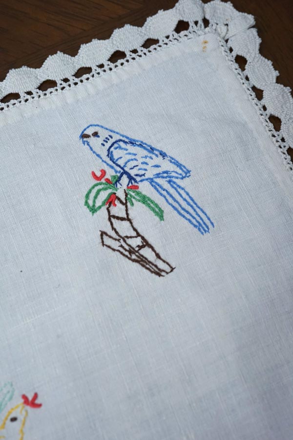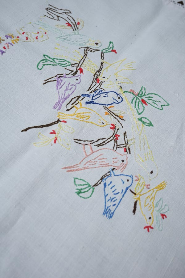 \一見何気ない刺繍かと思いきや小鳥たちの表情がエモーショナルです/