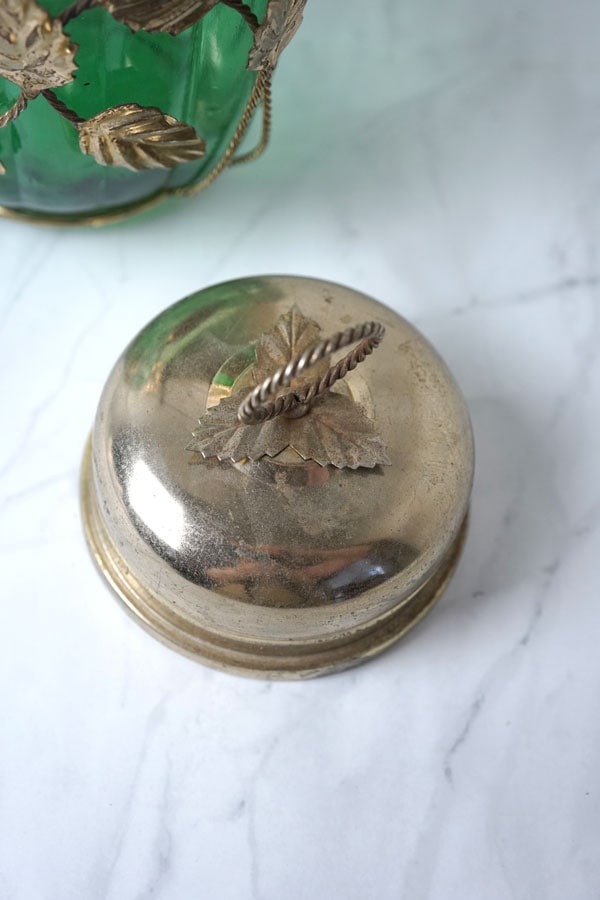 フランスで見つけたこのガラスポットは、1930〜50年代頃に作られたヴィンテージ品。蓋の裏に小さなオルゴールが隠された、遊び心のある一品です。