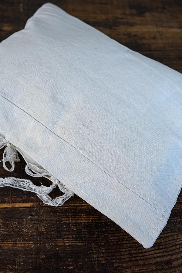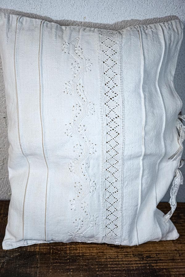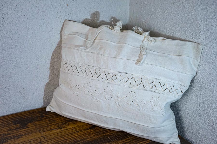 手織りリネンにカットワーク刺繍のクッションカバー