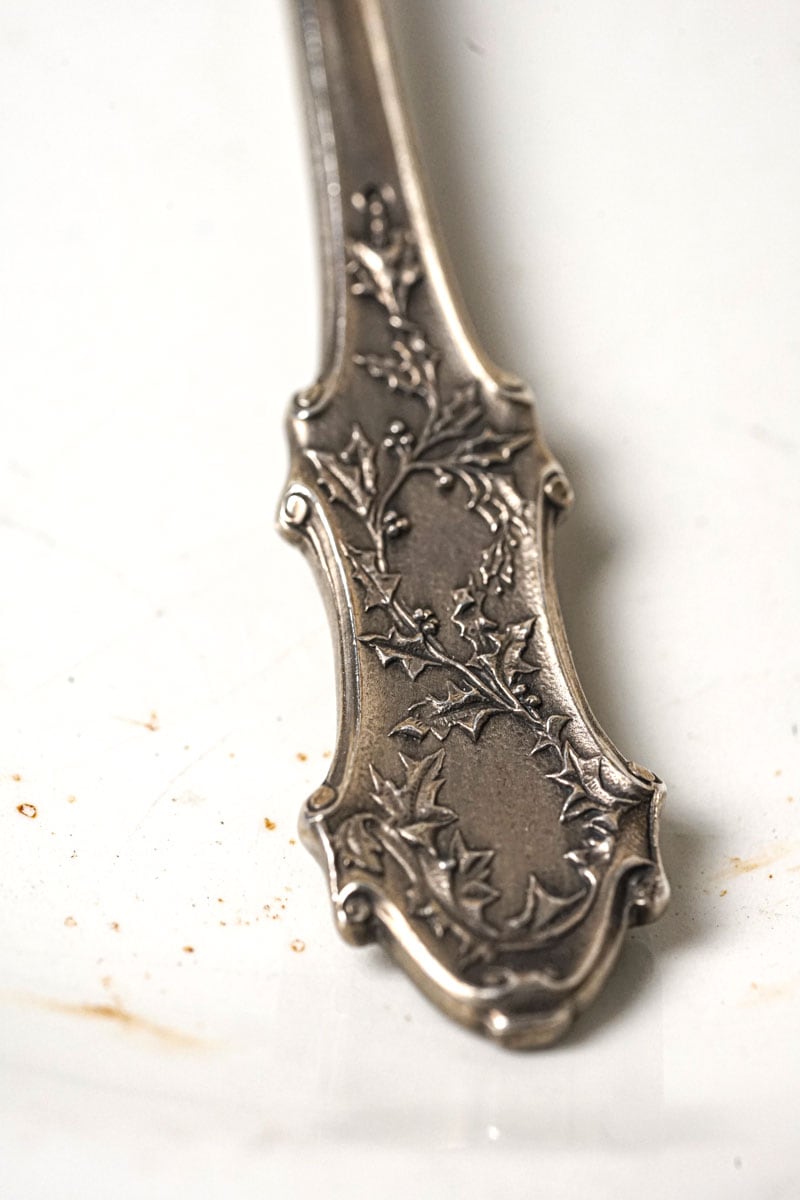 19世紀後半のフランスより、聖なる木「ヒイラギ」のレリーフが美しい純銀製スプーンが届きました。