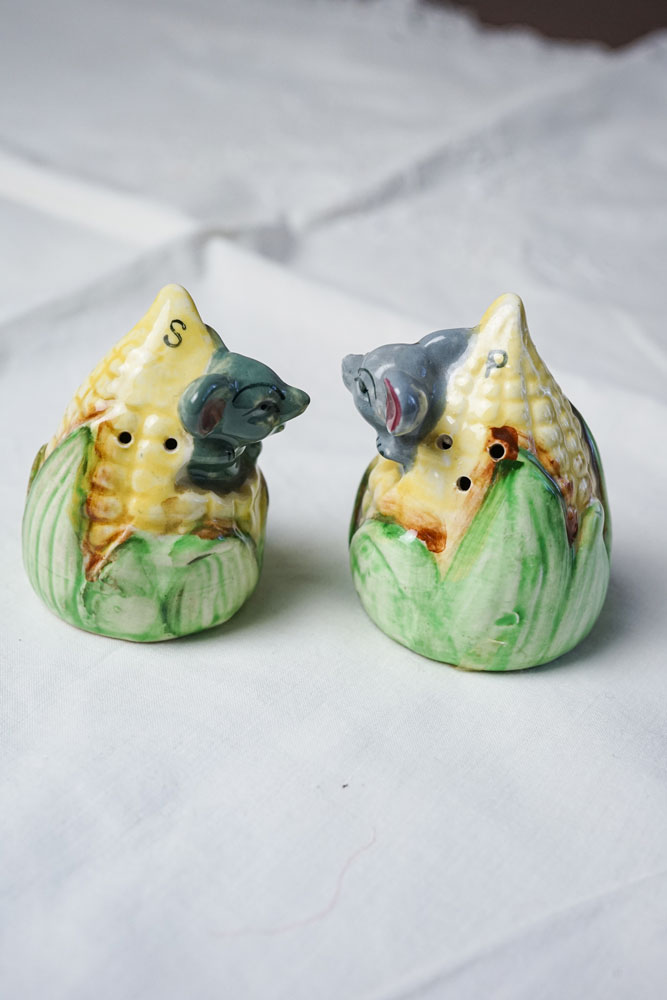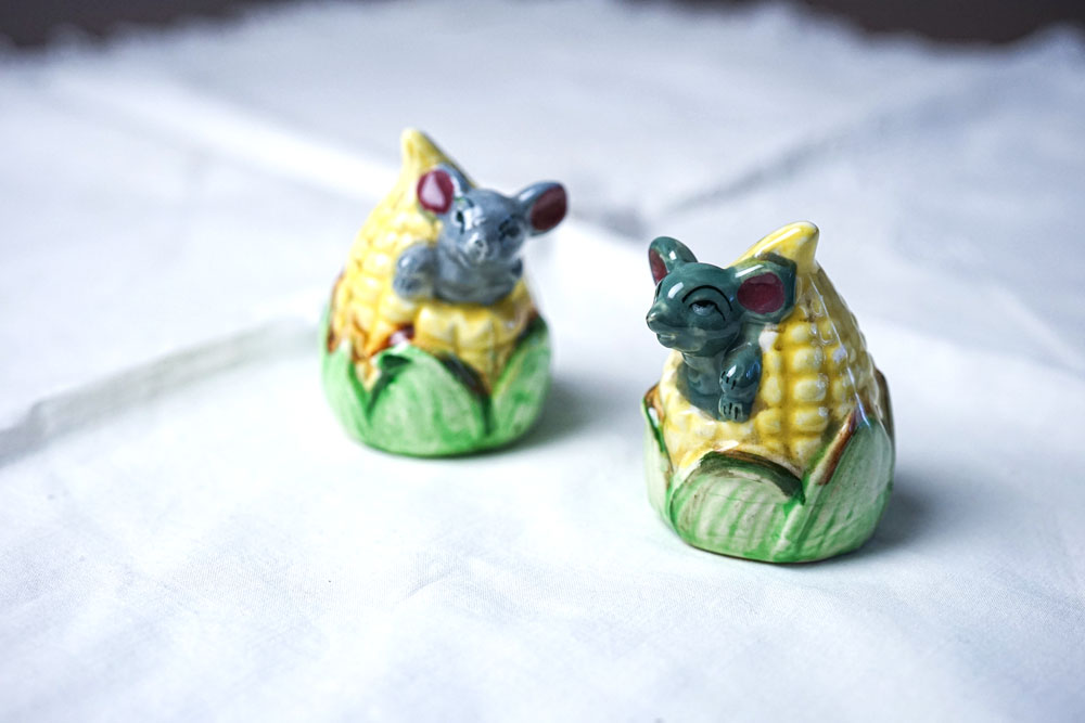 トウモロコシの家に住むネズミさんの陶器のソルト&ペッパー入れ 1950年代 gc-1943