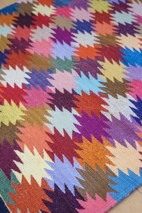 羊毛を糸に紡ぐところから始まり、植物や虫(コチニール)など自然の恵みで染め上げ、そして木製の織り機で一段一段、途方もない時間をかけて幾何学模様を織り上げていきます。