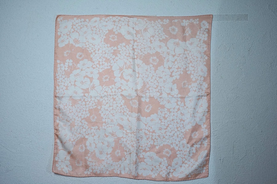 【英国ヴィンテージ】Jacqmar 桜色に白い花々が咲き誇る 上質なシルクツイルスカーフ(1960-70年代)68×67cm gd-298