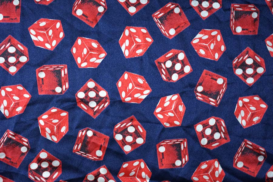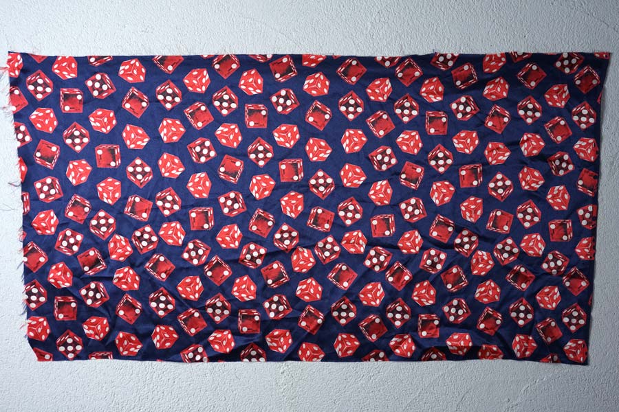 ネイビーブルーの地に、真っ赤なダイス(サイコロ)がコロコロと舞うように描かれた、とっても魅力的なヴィンテージファブリックです。