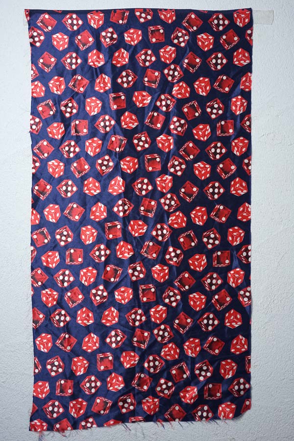 シルクのように上品な艶と滑らかな手触りを持つアセテート素材で、元々はスカーフ用に作られた生地かもしれません。一つ一つのダイスに描かれた陰影やかすれ具合などの表情がとても豊かで、見ているだけで心揺さぶられるような、レトロでポップな雰囲気がたまりません。