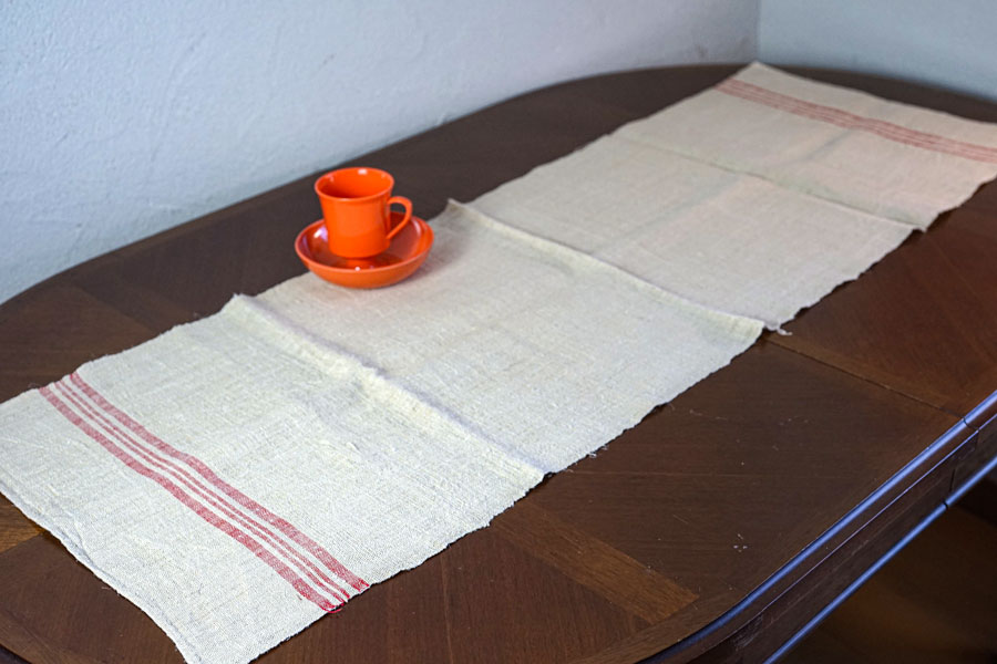 ハンガリーでは村々で栽培された麻糸を紡いで、日々の暮らしの為のリネンを手織していました。大切に織ったリネンを廿楽に入れて結納として嫁ぎ先へ持参したリネンの1枚です。こちらは生成り色のリネンで赤のラインが両サイドに入っています。シミもなく状態の良い未使用のリネンのランナーです。
