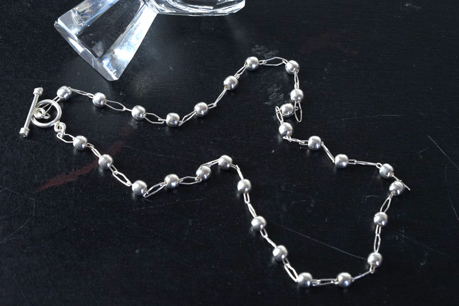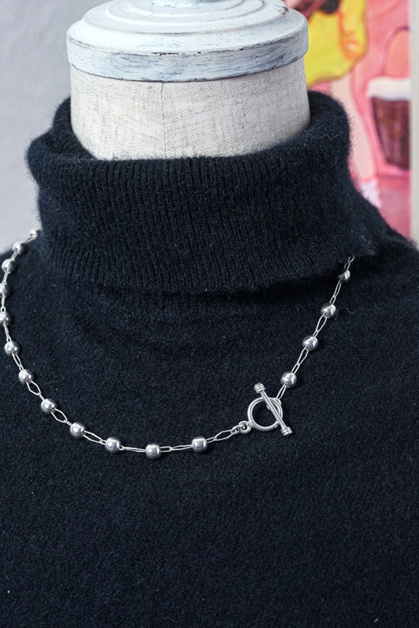デザインの特徴は、中空のシルバーパール(銀ビーズ)と、細身のチェーンを組み合わせた軽やかな構成にあります。また、留め具には存在感のあるTバー(トグル)が採用されており、機能性だけでなくデザインのアクセントとしてもお楽しみいただける作りになっています。