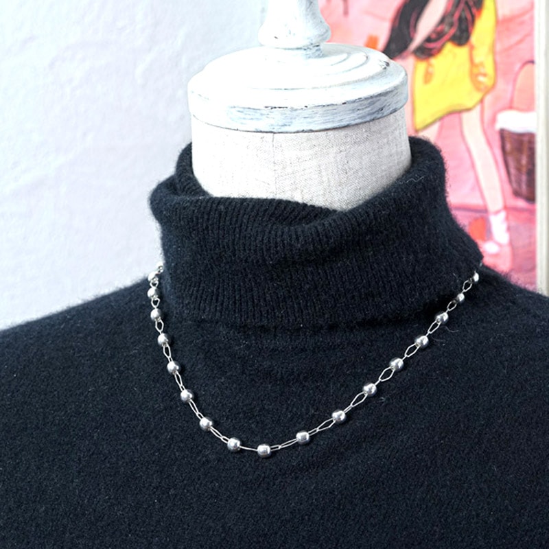 このネックレスの使いこなしとして、留め具をあえて鎖骨のあたりや正面に持ってくるスタイリングがおすすめです。シンプルなタートルネックやカットソーに合わせるだけで、装いに現代的な表情が加わります。シルバーパールは中空のため、見た目のボリュームに反して非常に軽く、日常使いでも肩に負担がかかりにくいのが魅力です。